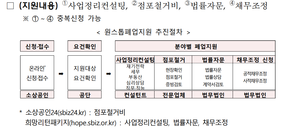 - 컨설팅/법률/채무조정: 희망리턴패키지 홈페이지(hope.sbiz.or.kr)에서 신청.